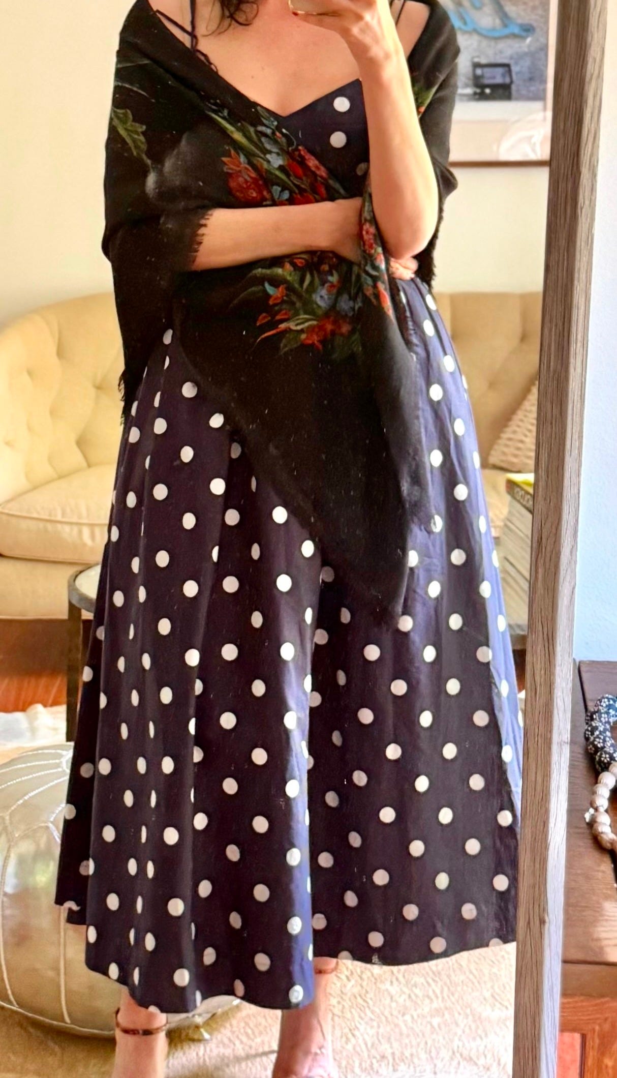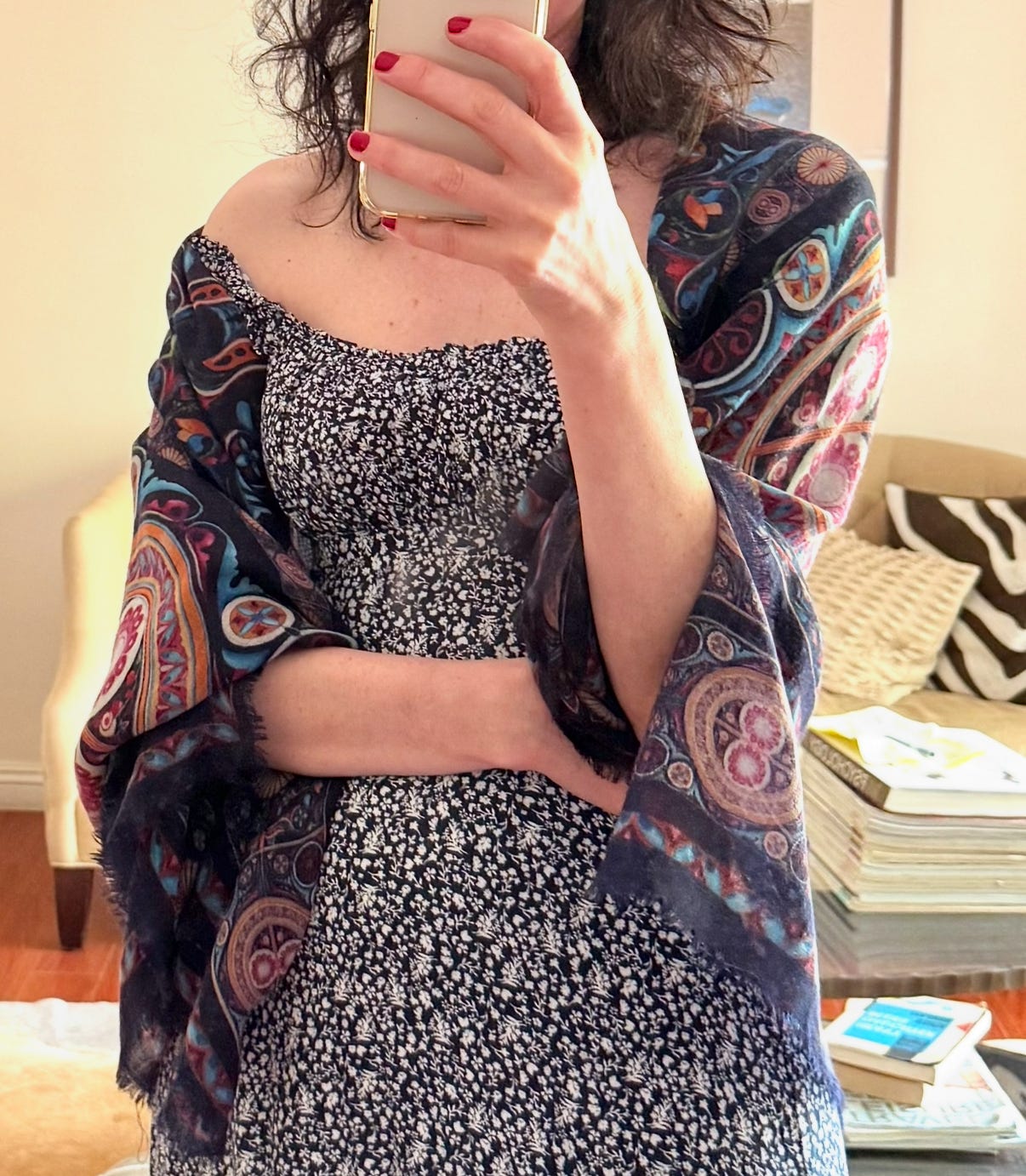 For a summer wedding, I wore a navy blue semi-puffy dress with classic white polka dots—elegant but fun. I added the Lori Scarf, which is black with oversized floral bouquets in vibrant shades. The contrast between the structured dots and the large, painterly flowers created a beautiful tension that felt dressy but not overdone. It was one of my favorite combinations—unexpected and memorable. I loved it so much that I also wore this combo to my Avaline collar dinner!