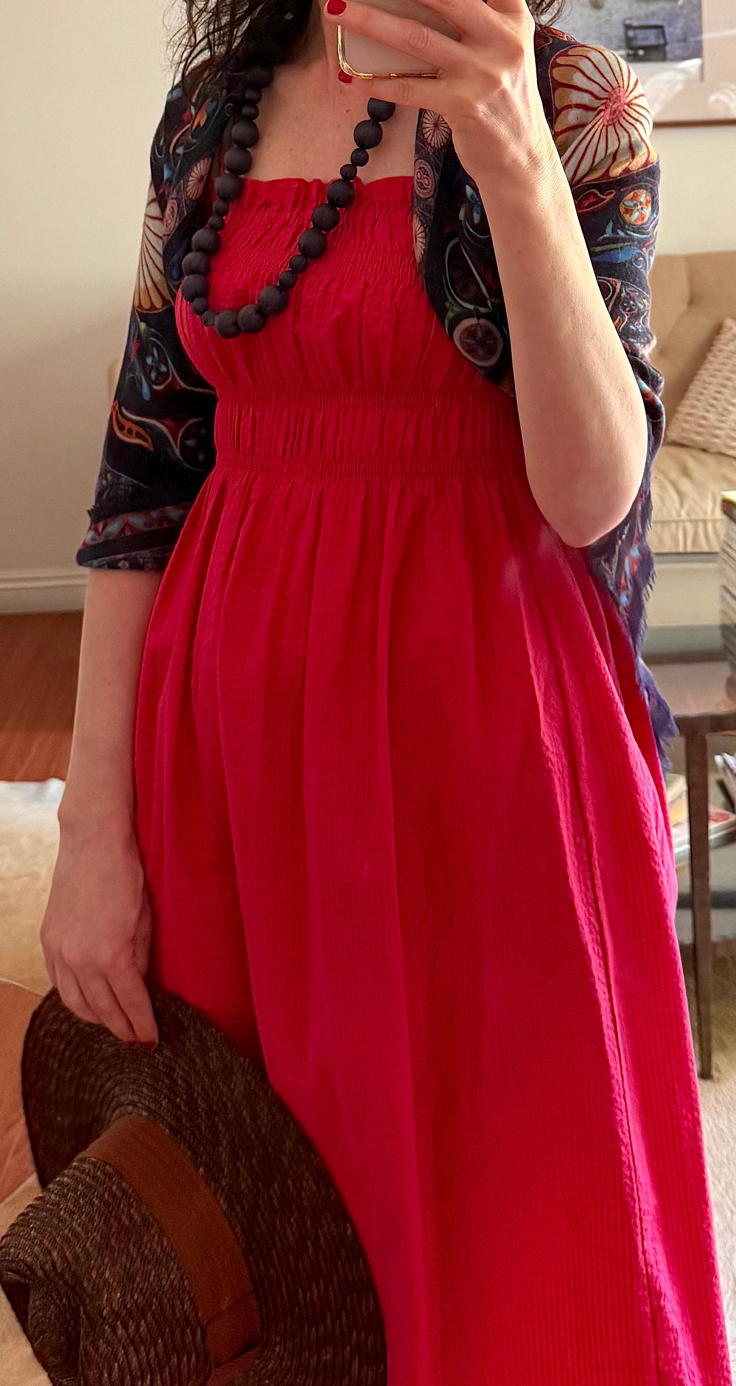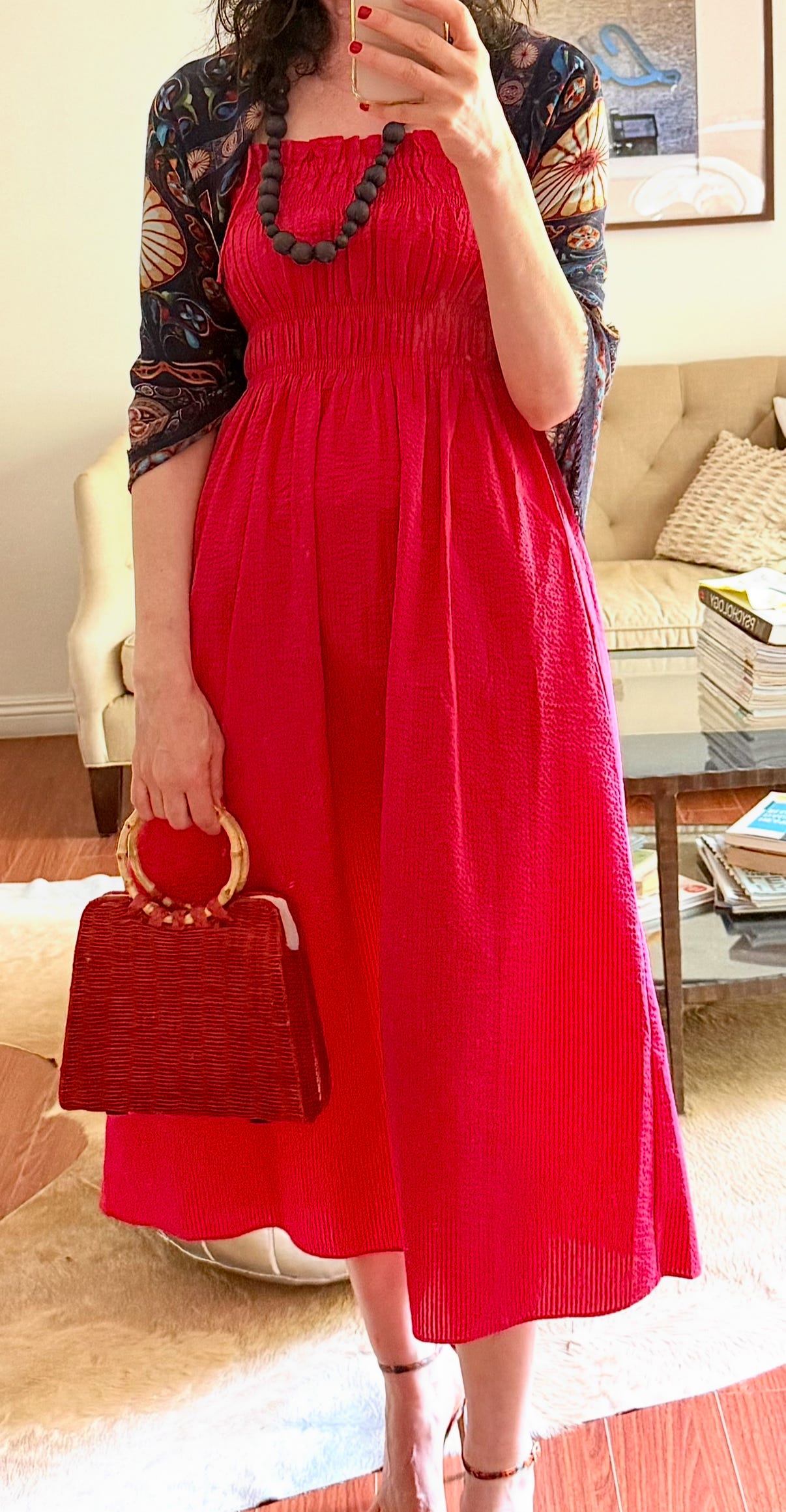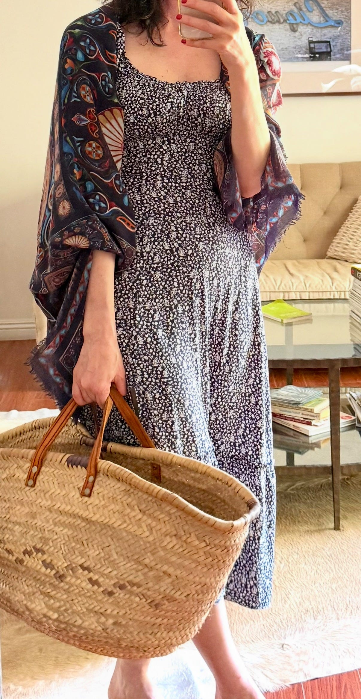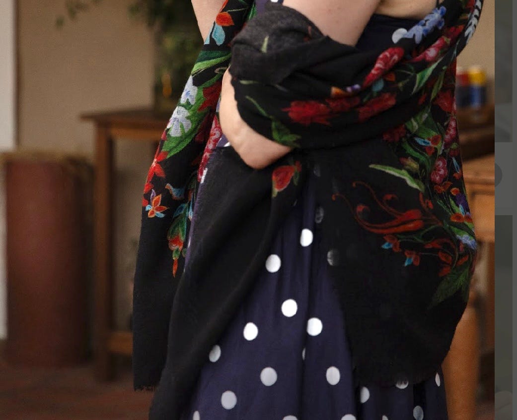 This one felt playful and full of character. This blue dress with tiny white flowers was charming on its own, but pairing it with the Azniv Scarf brought a whole new energy. The scarf’s navy base and sundial motifs in red, orange, and mustard made it feel bolder and brighter. I draped it casually over one shoulder and let the colors and shapes do the talking! It was the perfect ensemble for a day trip to Santa Barbara. I was happy to have my shawl around my shoulders as the weather got cooler at night.