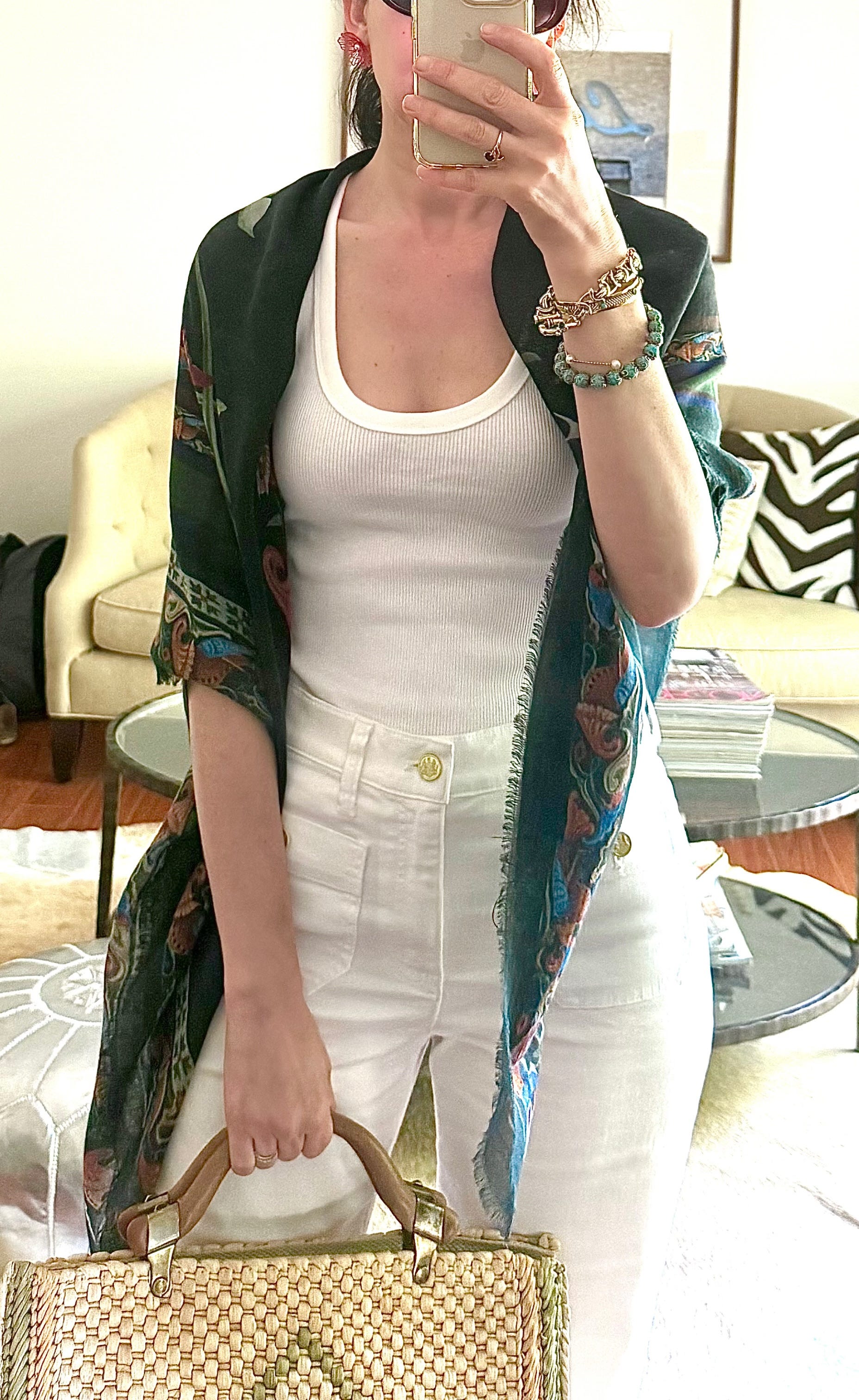 Getting dressed for happy hour, I kept it simple with white jeans and a tank top—clean, easy, and summer-ready. I brought along my Zabel shawl to drape over my shoulders once the breeze kicks in. It adds just the right touch of color and gives my outfit a point of interest without trying too hard.