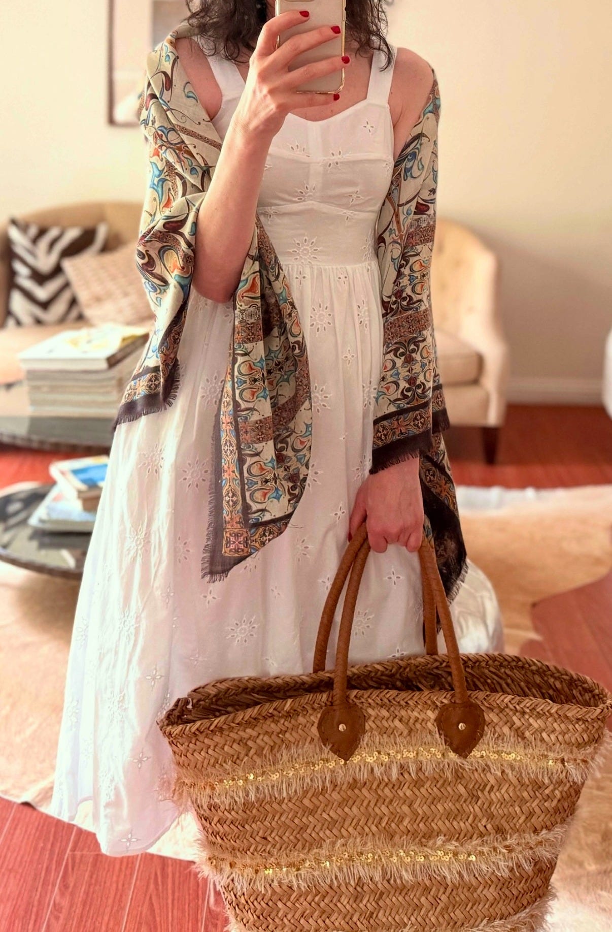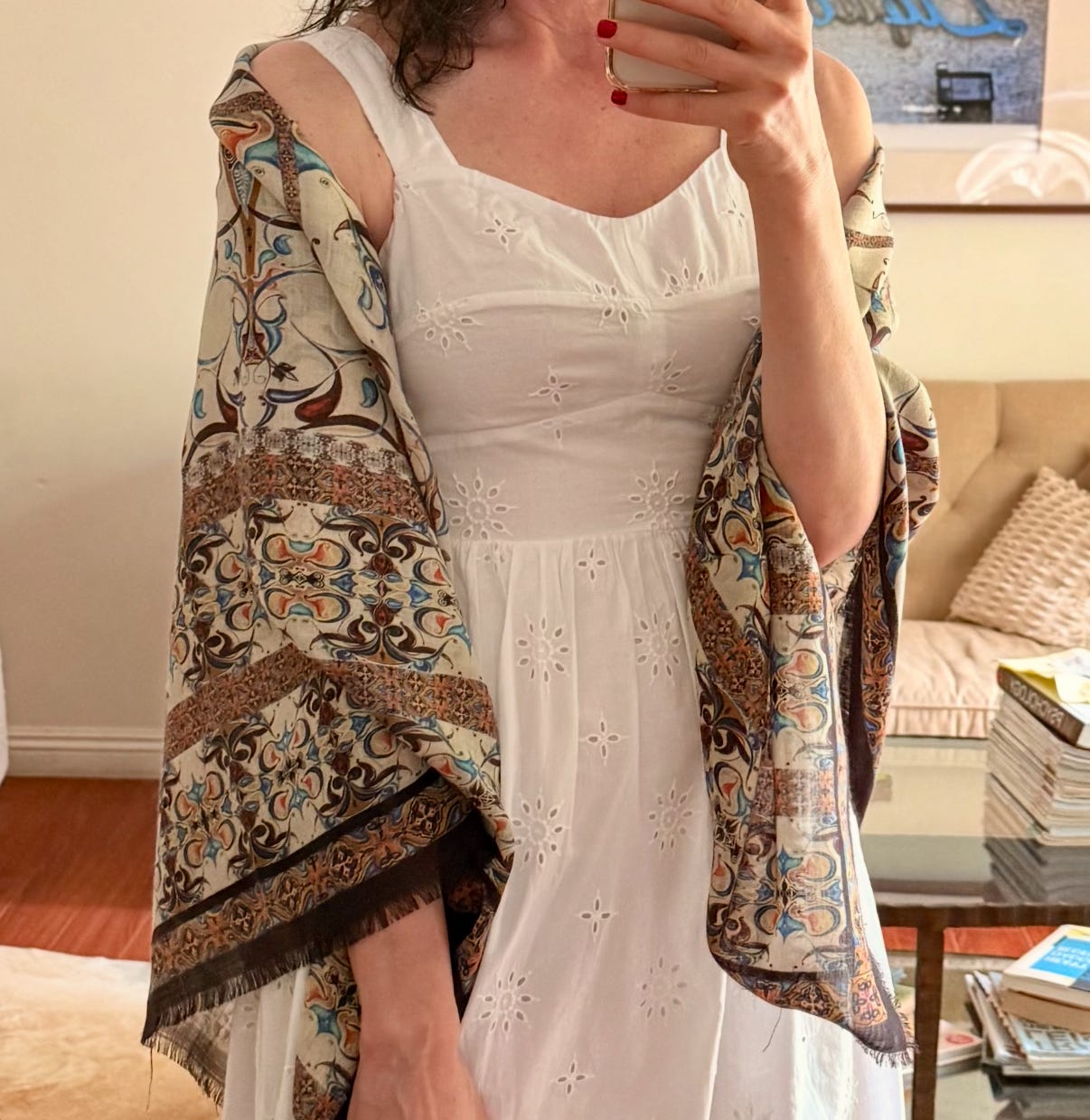 This white cotton dress is a summer staple—clean, breezy, and easy to style. I paired it with the Silva Scarf, which has a mix of burgundy and soft muted tones. Draped loosely over my shoulders, it added depth and contrast to the crisp white, giving the whole outfit a slightly romantic, old-world feel. It was simple, but definitely not plain. I wore this outfit to a brunch outing by the ocean.