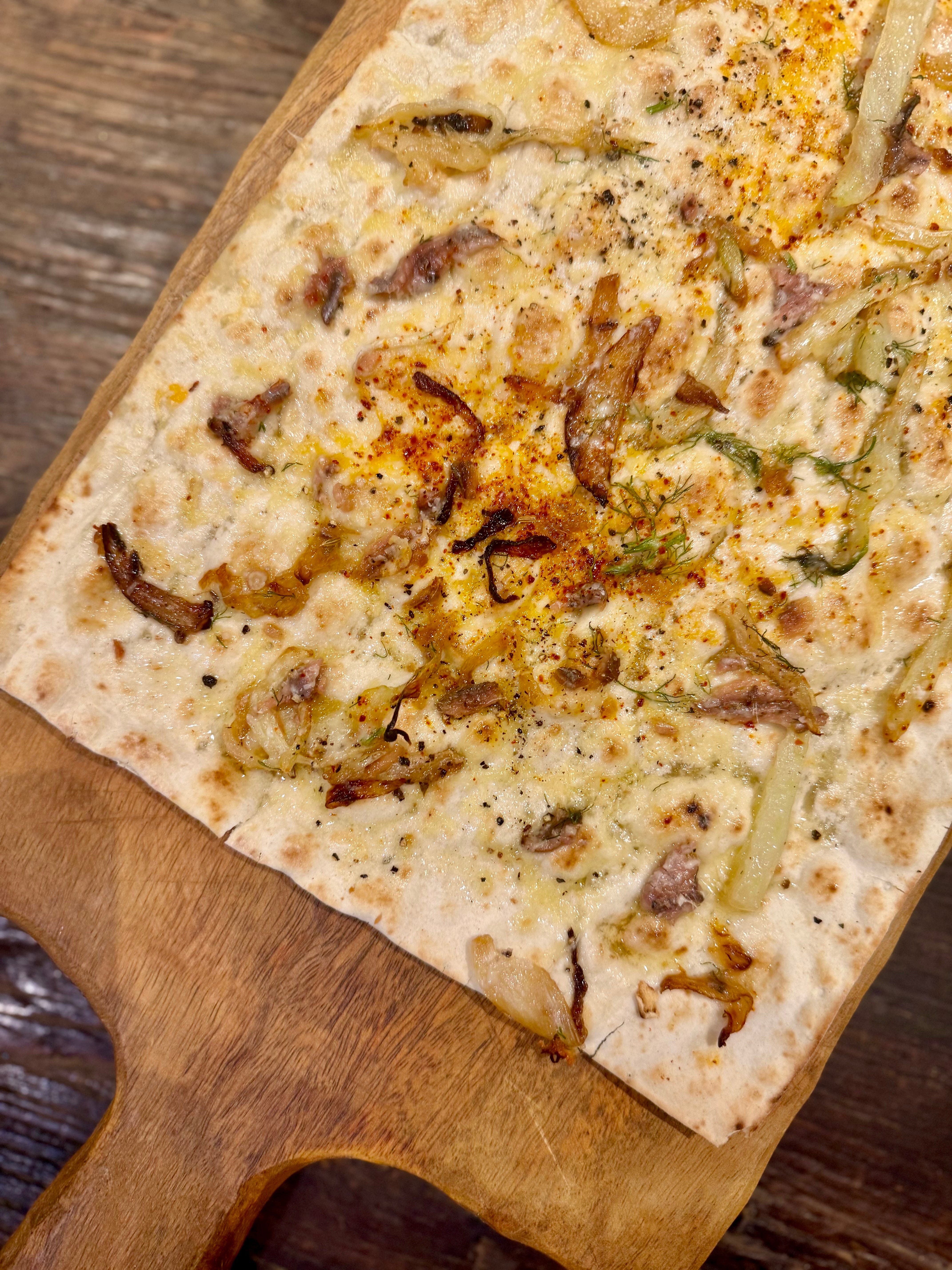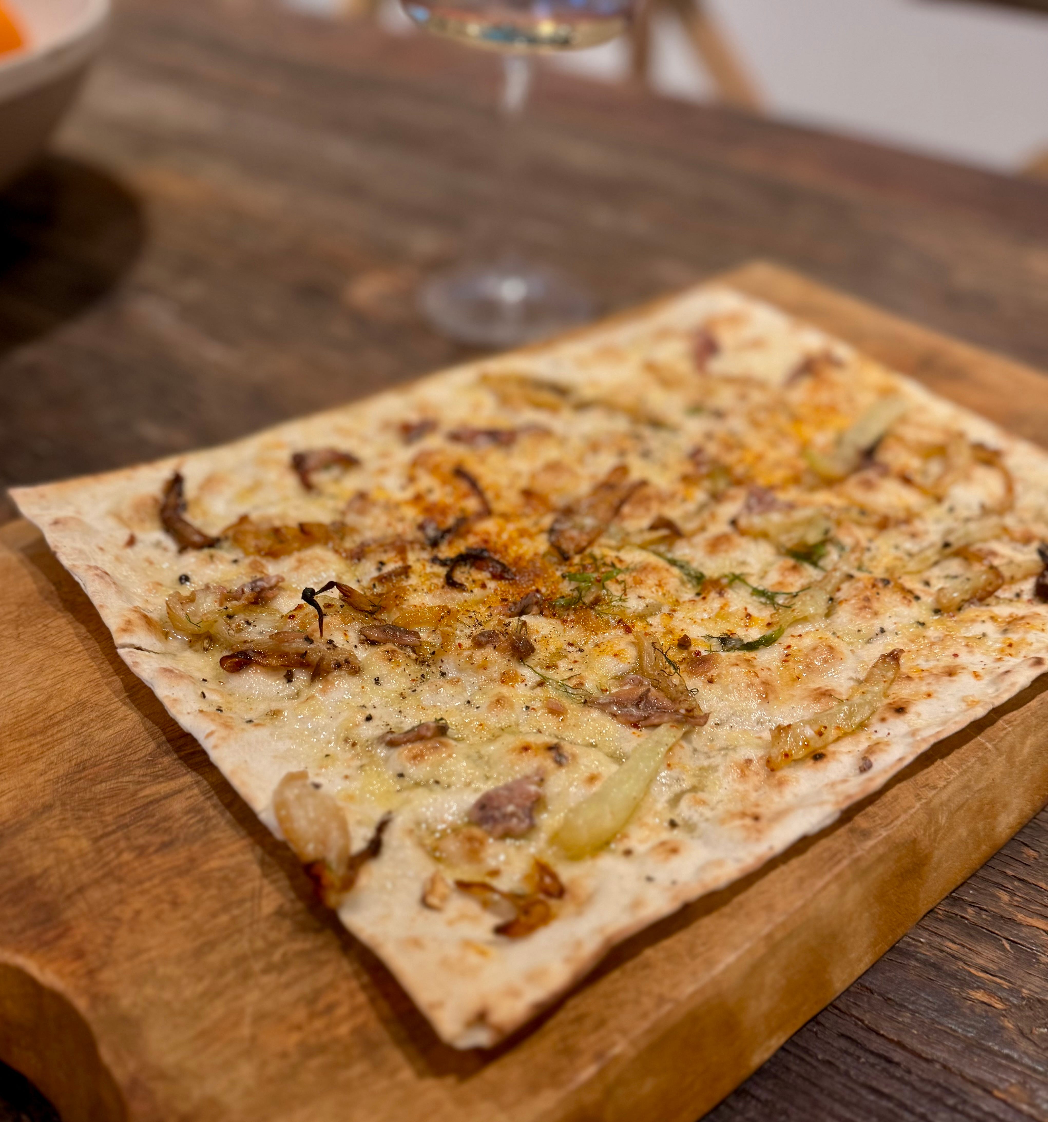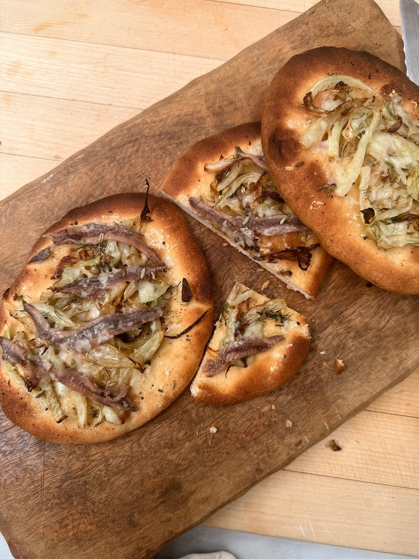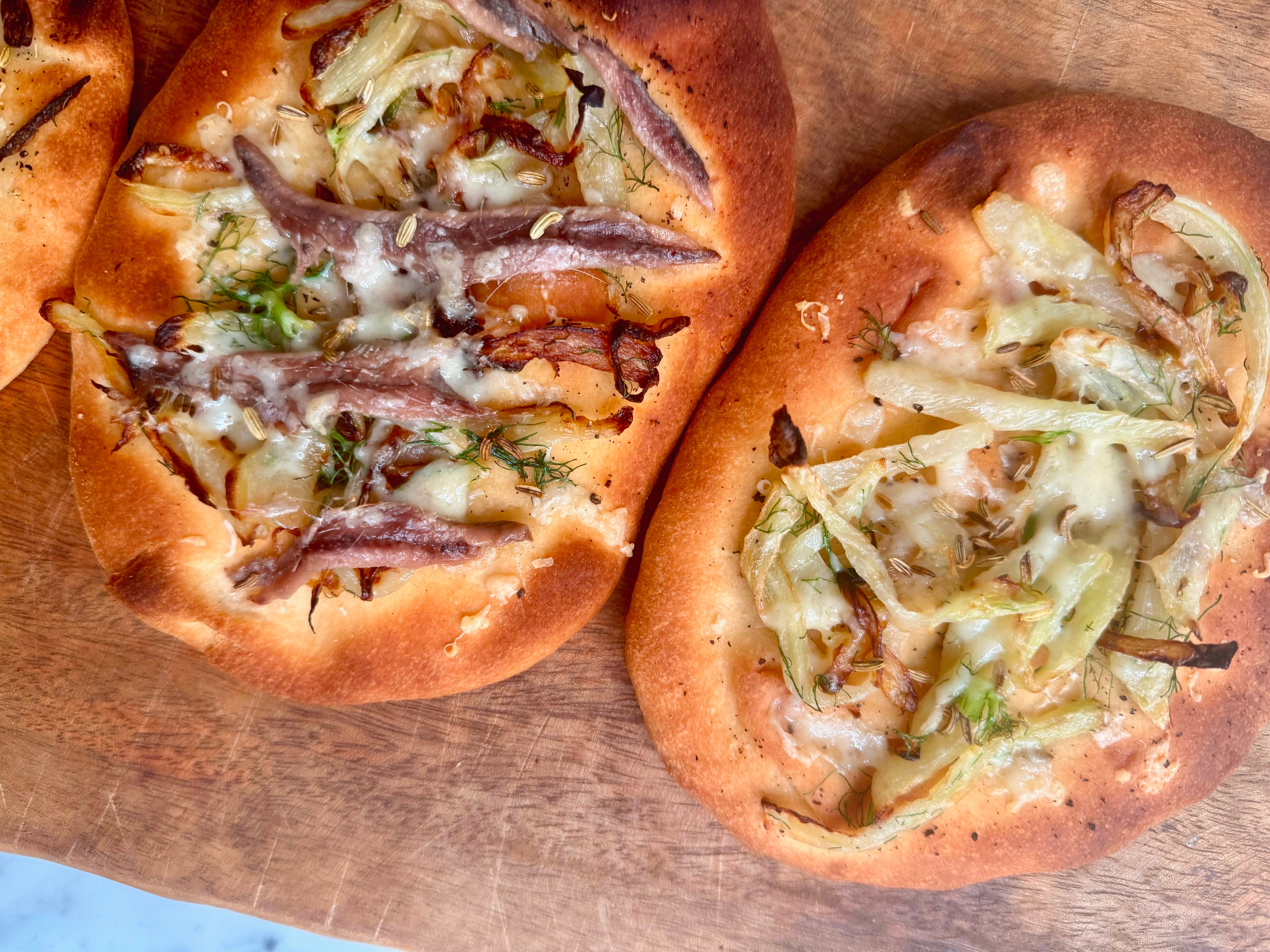 To build using Indian flatbread (which I preheated in the oven to my desired crispiness), I spread a layer of the fennel mixture on top—roughly a quarter per piece. Then about two tablespoons of grated caciocavallo, four anchovies per flatbread (just enough to get that salty pop in every bite), sprinkle with fennel seeds and top with remaining cheese. For the lavash I just used a whole sheet topped it with the fennel mixture, fennel seeds, cheese and desired amount of anchovies.