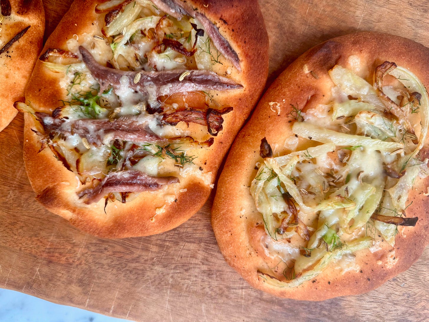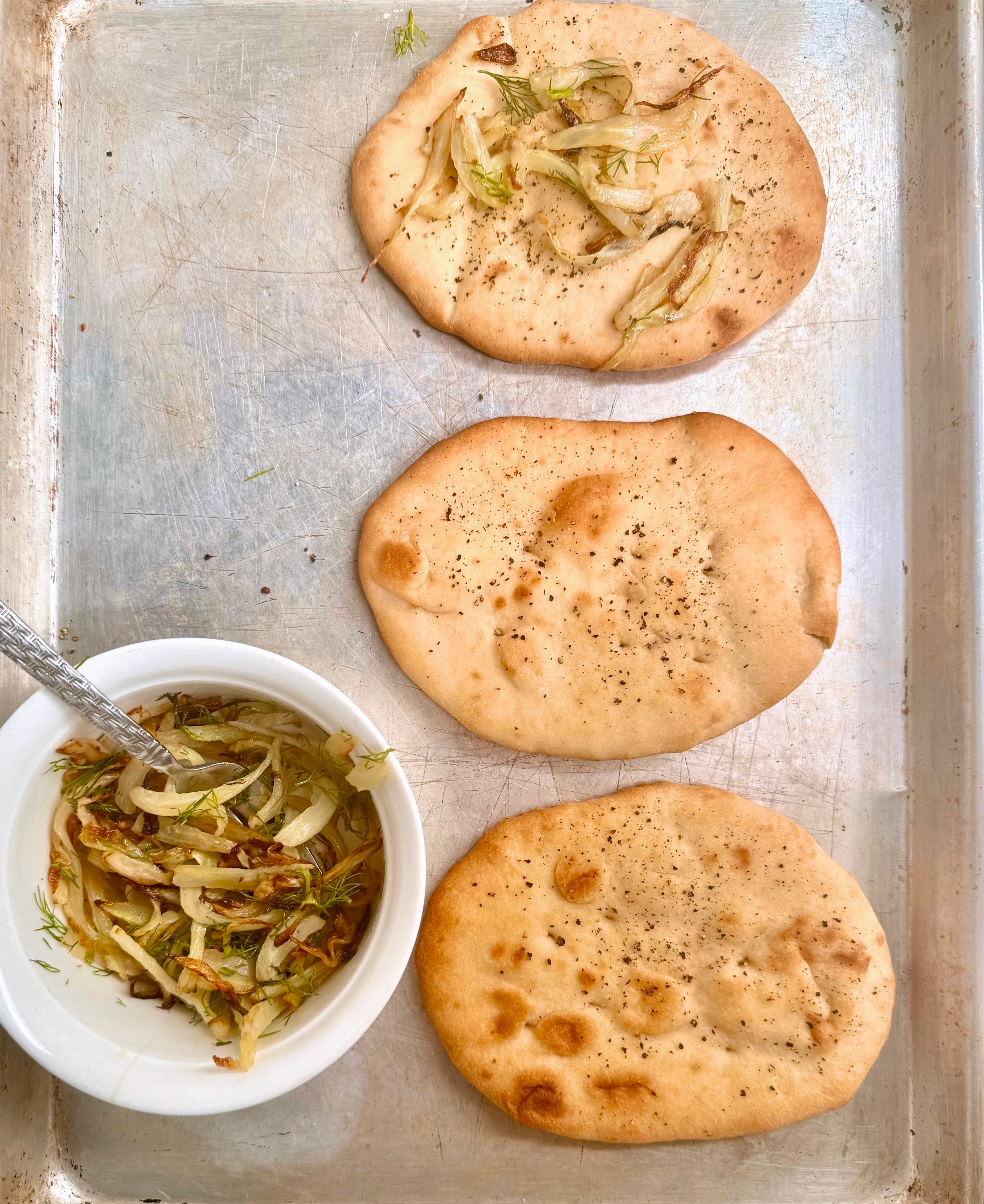 Tonight, I'm serving my twist on tarongia, a delicious Sicilian snack traditionally made with fried dough topped with fennel, anchovy, and caciocavallo cheese. Instead of the classic dough, I used Indian flatbread and Trader Joe’s lavash.
